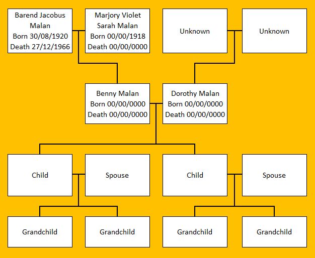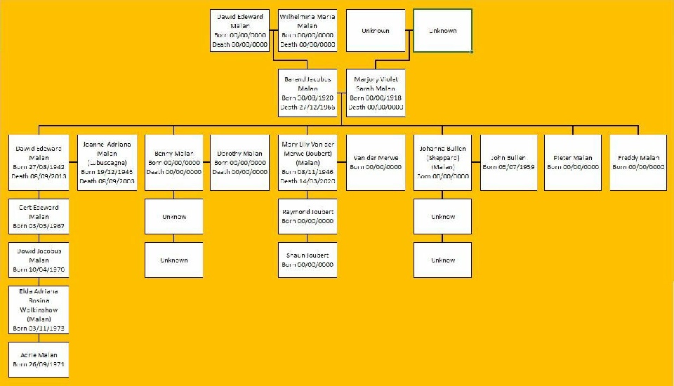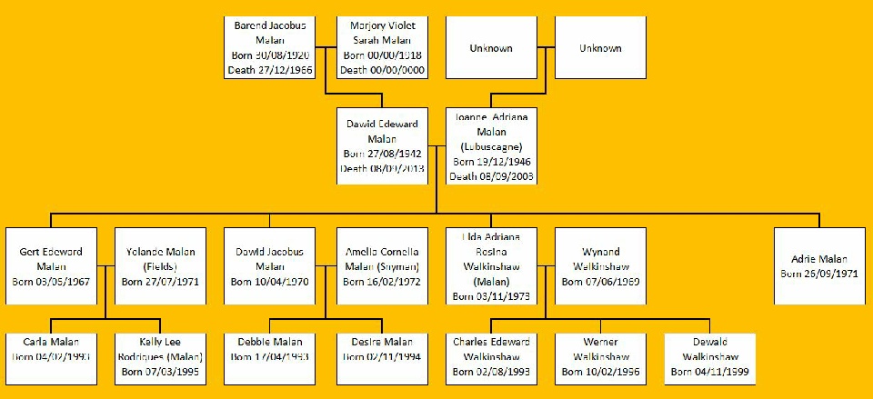 Dawid Edeward Malan, son of Barend Jacobus Malan with wife Joanne Adriana Malan with all children and grandchildren.