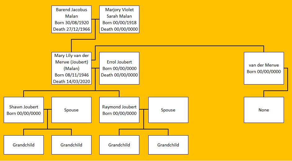 (Lily) Mary Lily van der Merve (Joubert) (Malan), daughter of Barend Malan and Marjory Malan with first husband Errol Joubert and second husband van der Merwe with all children and grandchildren.