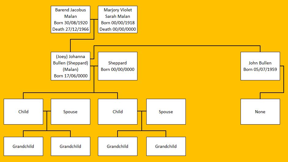 (Joey) Johanna Bullen, daughter of Barend Malan and Marjory Malan with first husband Sheppard, second husband John Bullen and all children and grandchildren.